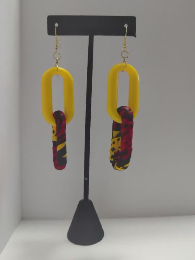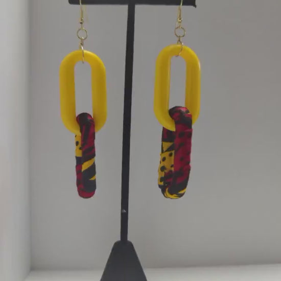 Make a statement with these vibrant, handcrafted earrings that blend modern flair with cultural richness. Each pair features a striking combination of materials: a glossy, oval-shaped yellow plastic loop paired with a smaller, fabric-covered ring adorned in a vivid red, black, and yellow pattern. Suspended from elegant gold-colored hooks, these earrings offer a lightweight feel with eye-catching impact. Perfect for adding a pop of color to any outfit, they celebrate the fusion of contemporary design and traditional textile artistry.